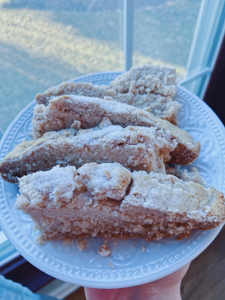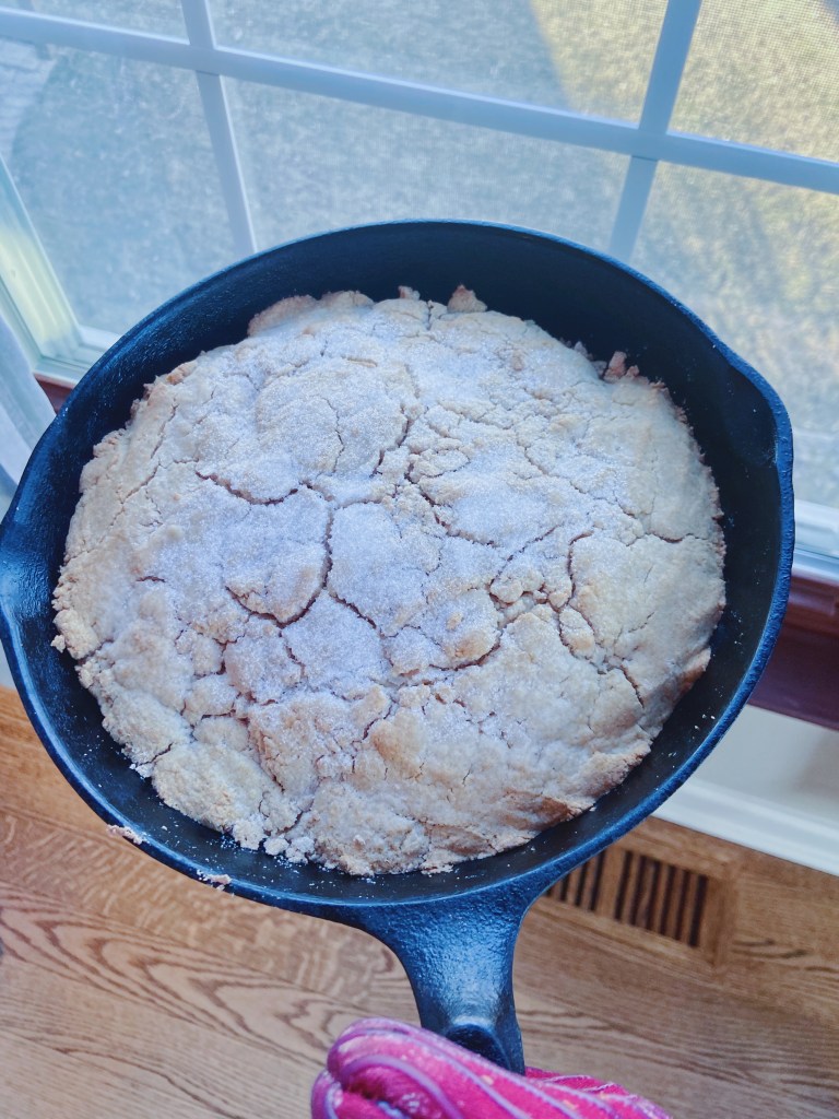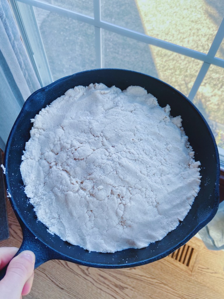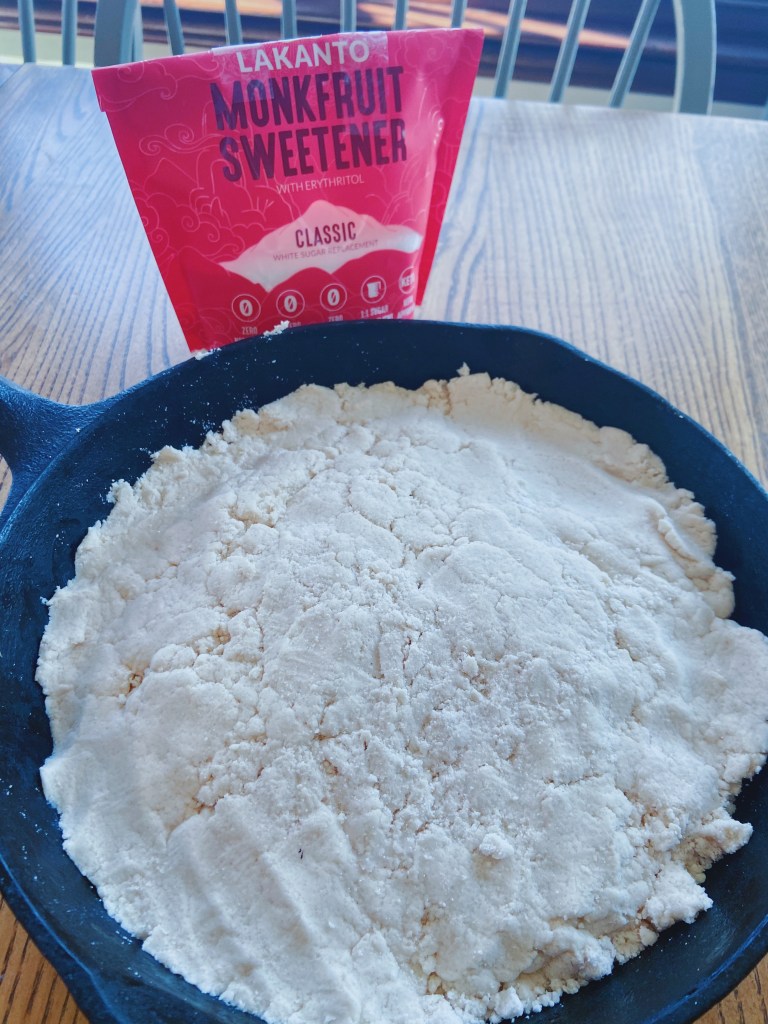 I should have taken a picture of the consistency, but it resembled a cookie dough. I placed this dough in my cast-iron skillet. Come on, ya HAVE to make it in the skillet. I feel like it makes it more authentic LOL. BUTTTT I understand that not everyone has this skillet pan, so a pie pan would work as well. I pressed the dough into the pan and then topped it with some extra monk fruit sweetener. (You can’t really tell, but it’s there in the picture on the right!!!!)