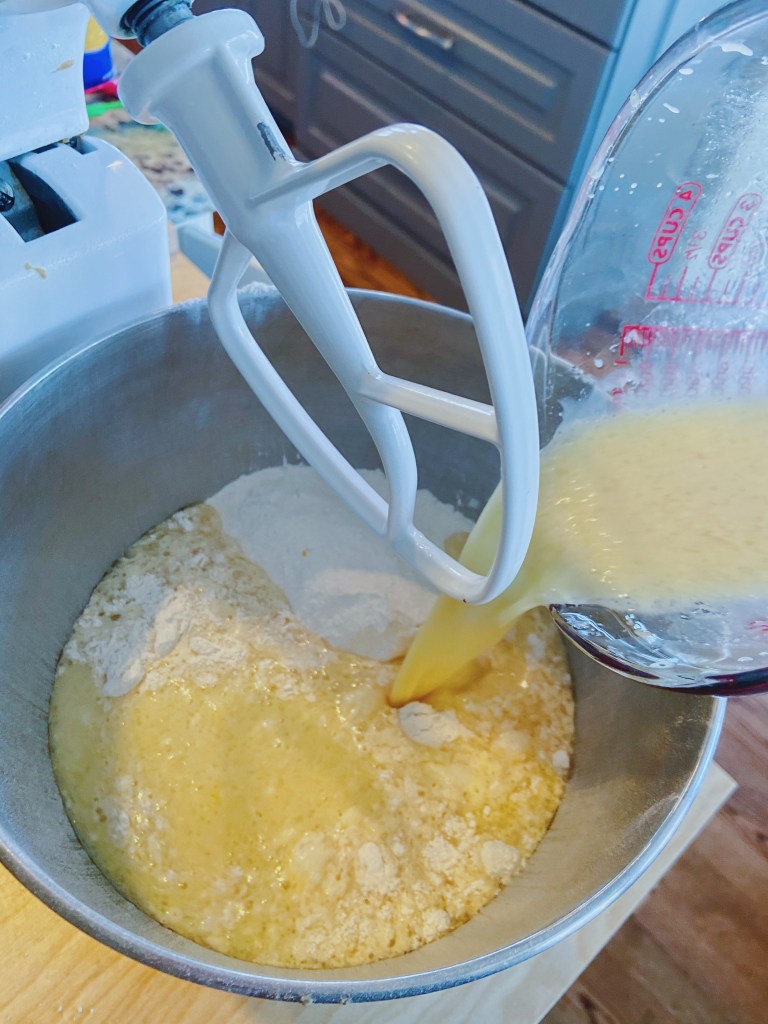 So back to the bread making…I combined all my dry ingredients (flour, monk fruit sweetener, baking soda, baking powder, and salt). Then I combined my wet ingredients (melted coconut oil, almond “buttermilk” made from almond milk and lemon juice, egg, and vanilla). Using an electric mixer, I mixed the dry and wet ingredients.