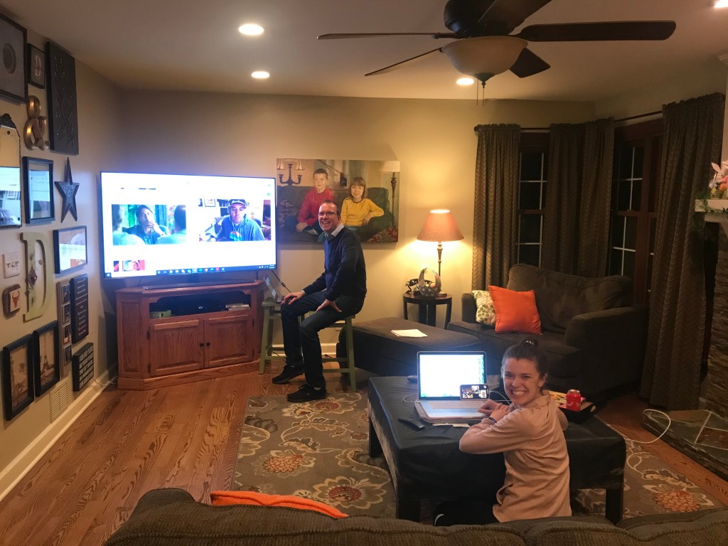 Our Trivia Set Up: YouTube LIVE Stream on our TV and Group FaceTime/Zoom & Submission Form on a computer!