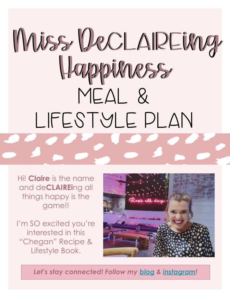 I have just created my FIRST EVER Chegan Recipe & Lifestyle eBook!! If you’ve been following my instagram recently, you will see that I have made the shift to fueling my body with whole, plant based foods…. plus some animal/meat options. I call it CHEGAN! If you are interested in receiving this eBook, all ya have to do is share your email with me!!! You can email me at missdeclaireinghappiness.com, message me on instagram, contact me on this blog, or comment below… whatever you are comfortable with!