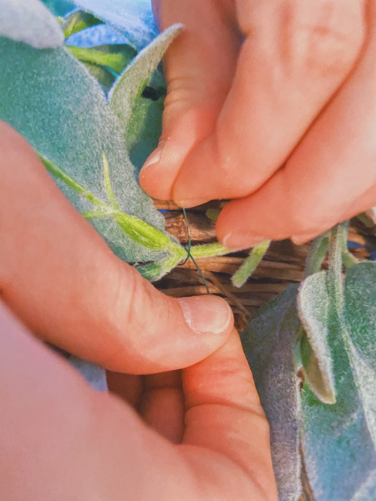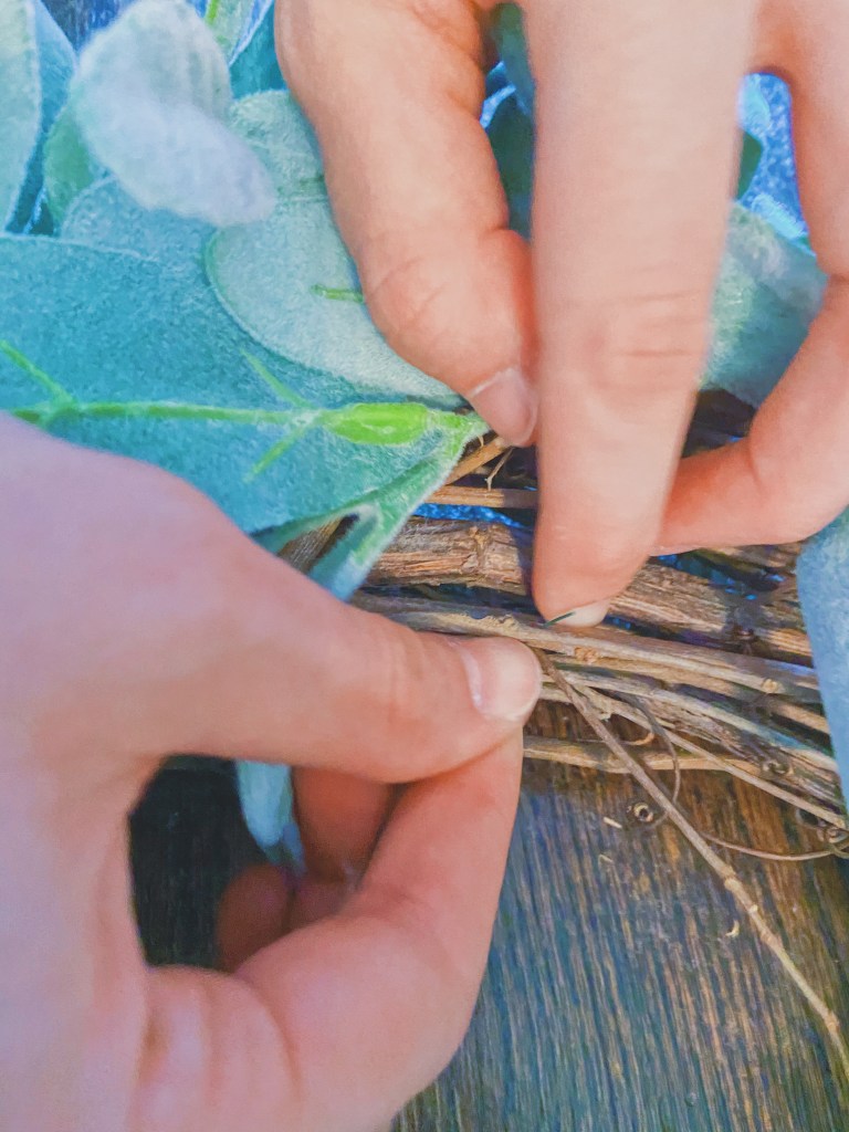 Then, you’ll need your wire and wire cutter! Cut pieces of wire–about two to three inches long–and form a “hook” at one end. You’ll hook/loop the wire in the wreath and then fasten it around the stem of your greenery. I joked that this is a game of “Where’s Waldo”, but it’s “Where’s the Wire” since it may get lost in the wreath.