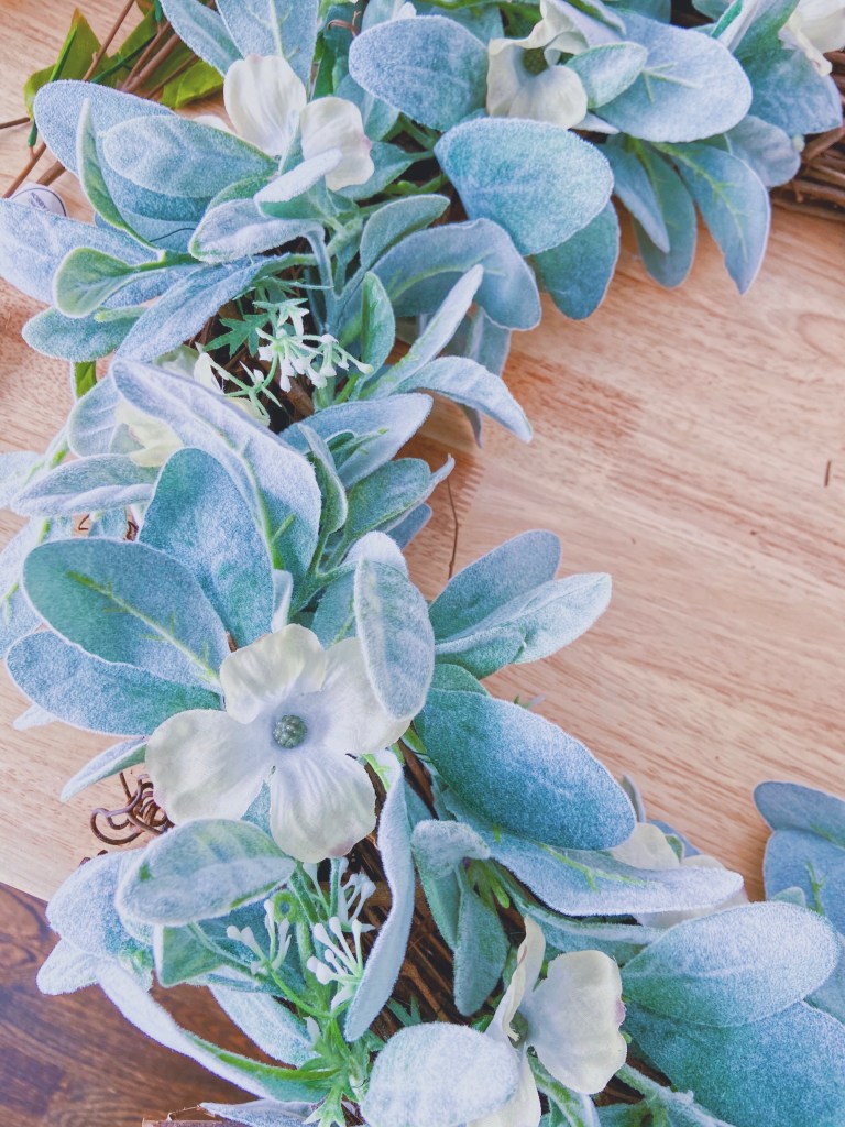 Here is where you can use your best judgement!! I found that some flowers, I could easily fasten to my garland and/or wreath with the floral wire. However, for other flowers that had longer stems, I simply stuck them in between the twigs of the wreath. I flipped my wreath over and gave it a little shake and they didn’t fall off. If you have hot glue, you could even use a little bit to glue the flowers in place…up to you! I would just recommend do the “shake test” to make sure that nothing falls out!