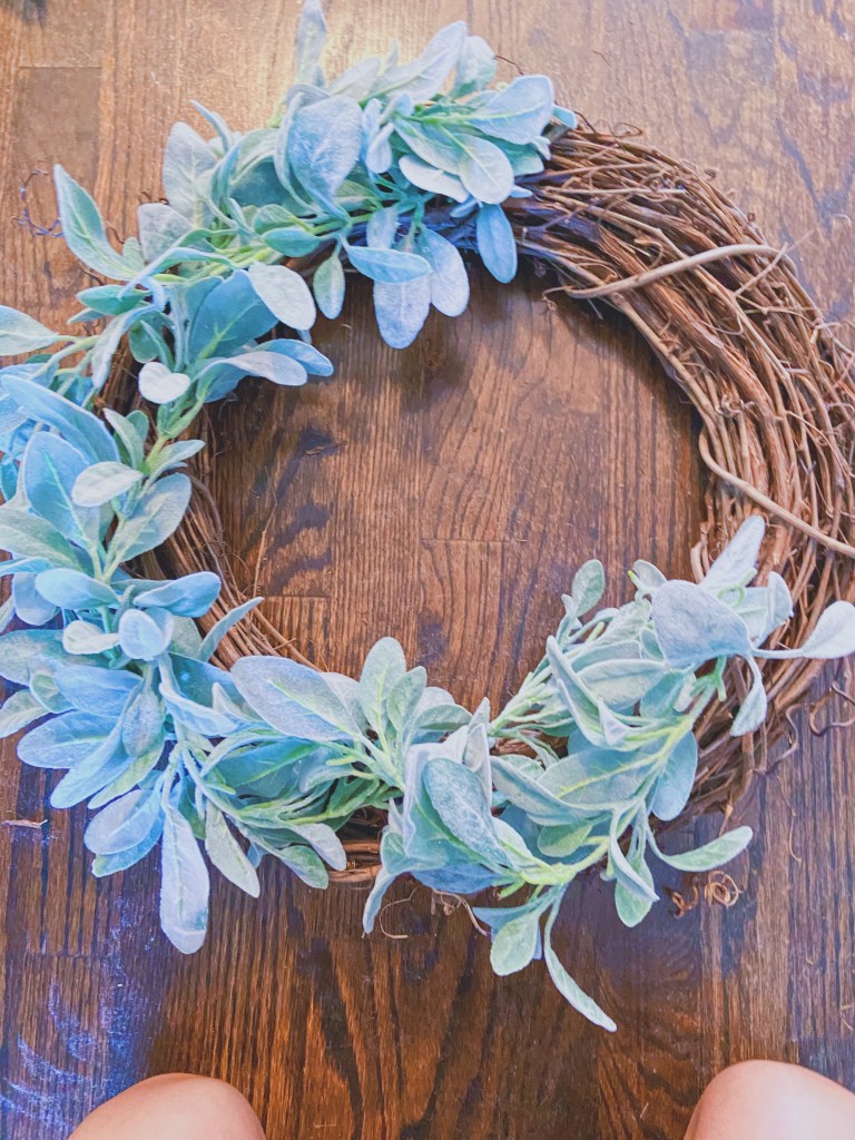 To start, I would recommend laying out your floral pieces on top of your wreath and arranging them how you would like them. I don’t have a picture of this nor do I have this on my video instructions, but I tried laying the greenery and flowers out in different ways until I found the way I liked best.