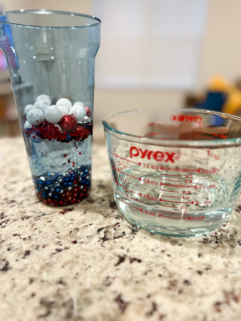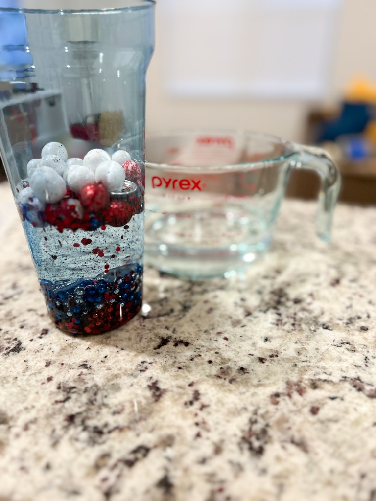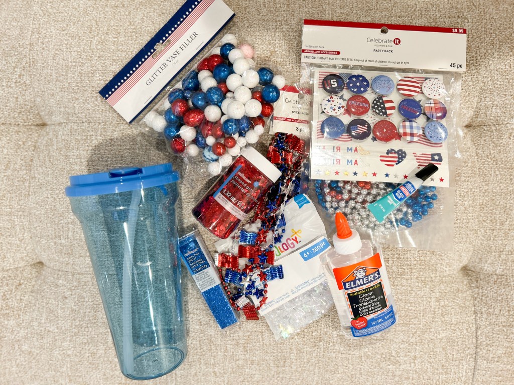Step 1: Grab some festive supplies at Michaels or the Dollar Store (everything was a little picked over because I bought them the day before Fourth of July BUT it was super cheap and on sale. So decide what is more important to you!). I think I found a good mix of necklaces, vase fillers, glitter, beads, and pins. Honestly THINK CREATIVELY. Just grab anything that is red, white, and blue and looks fun.