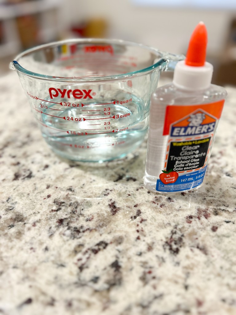 Step 2: Mix an entire bottle of clear liquid glue with 2 cups warm water. Use a fork and whisk it together. This helps prevents bubbles from appearing in your bottle later.