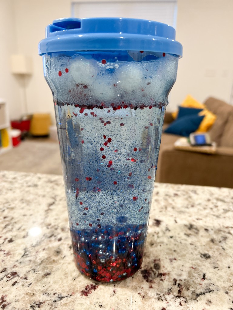 I cleared some furniture and laid down a tablecloth. I could of totally done this outside, but the heat was not fun and I didn’t have the energy to be chasing around JoJo in our neighbors’ yards lol. The first activities we did was this “Sensory Bottle”.