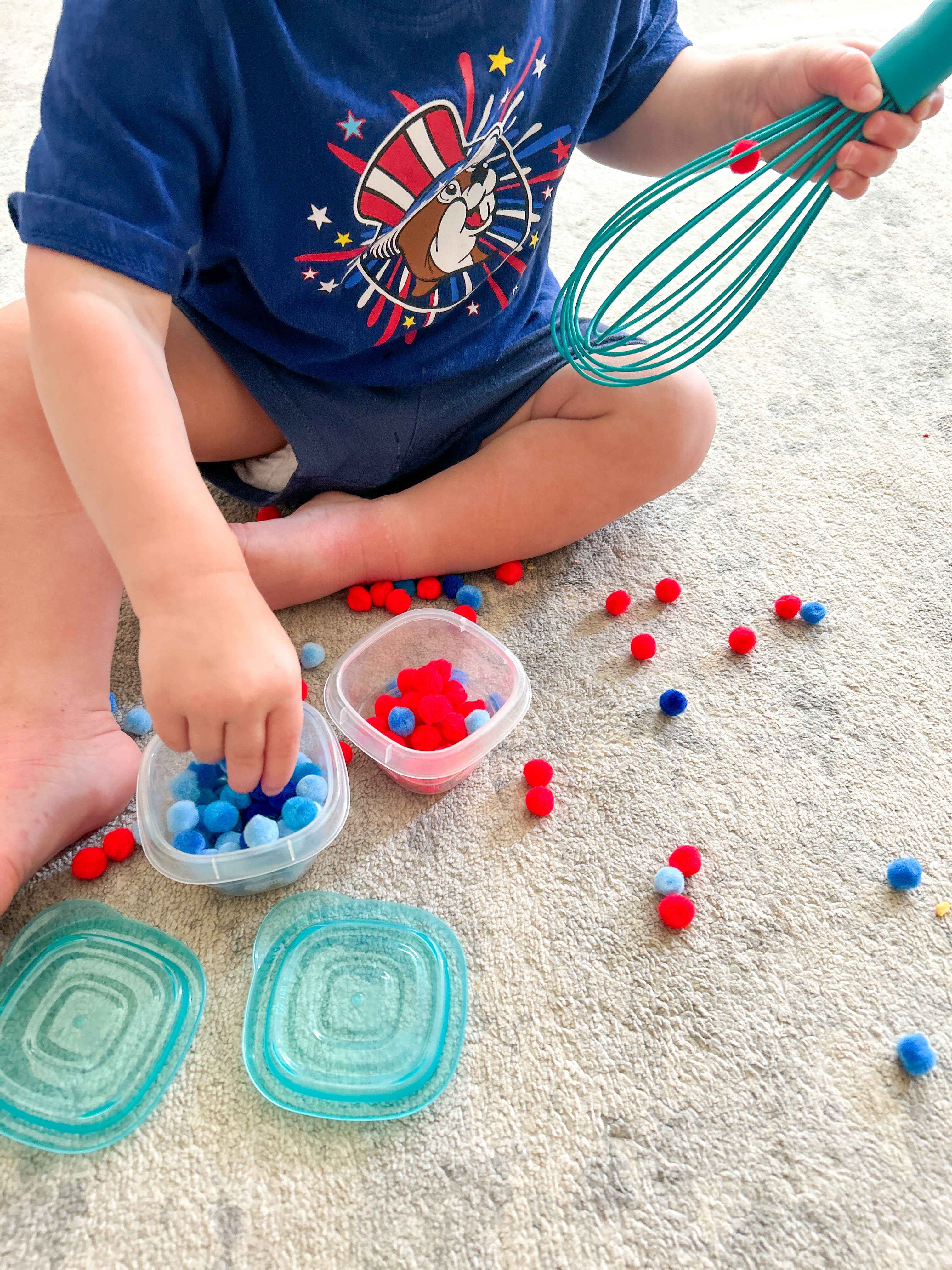 So, not to my surprise, he loved this! He got the hang of putting the pom-poms in the whisk after he took them out! #GoFineMotorSkills