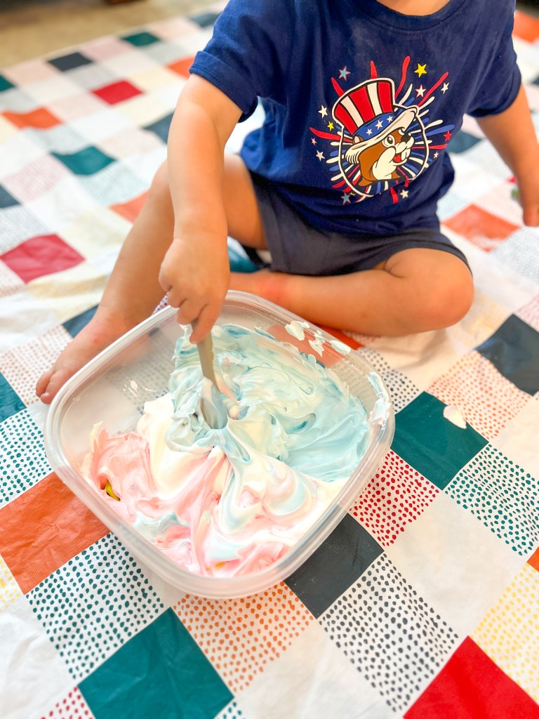 JoJo had so much fun with this!! Then, he started smearing the cream on his leg (?!) Idk toddlers, man!!! In the spirit of celebrating our freedom today, I gave JoJo the freedom to do whatever he wanted with the cream as long as it didn’t leave the tablecloth lol. SOOOO I got some Cool Whip on my leg and arms. The pure joy in his face playing with this was so fun. I would totally do this again!!!