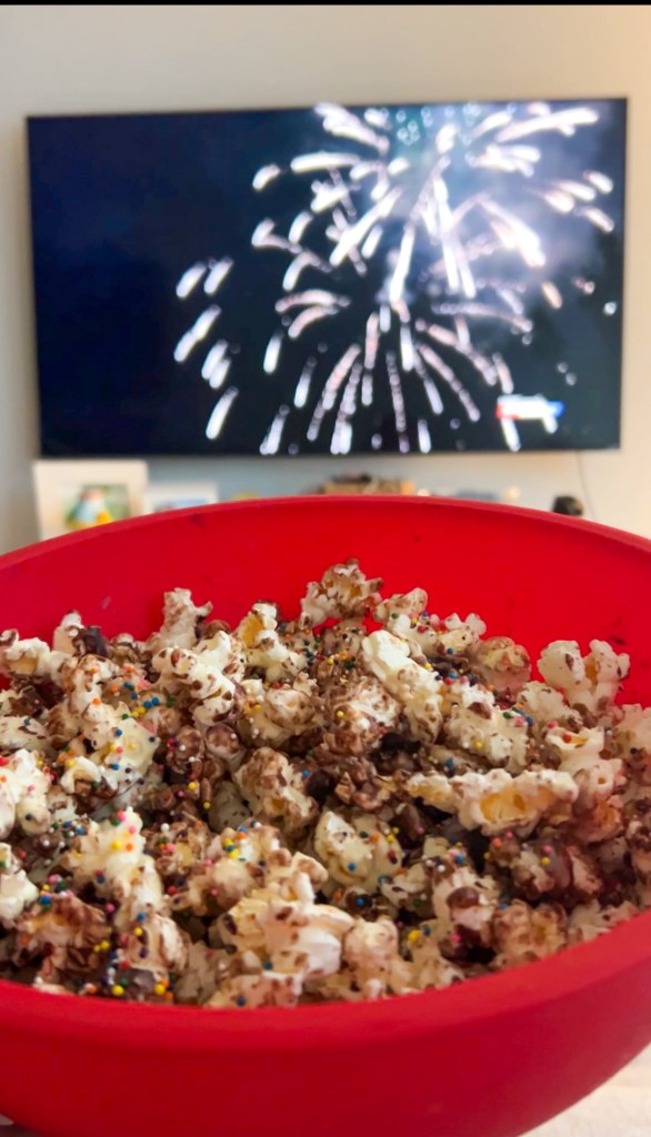 I ended the night streaming some local fireworks and eating my FAV homemade chocolate covered popcorn. When your resident husband is working nights, you’ve gotta do something extra to make your nights special. So I treated myself with the popcorn